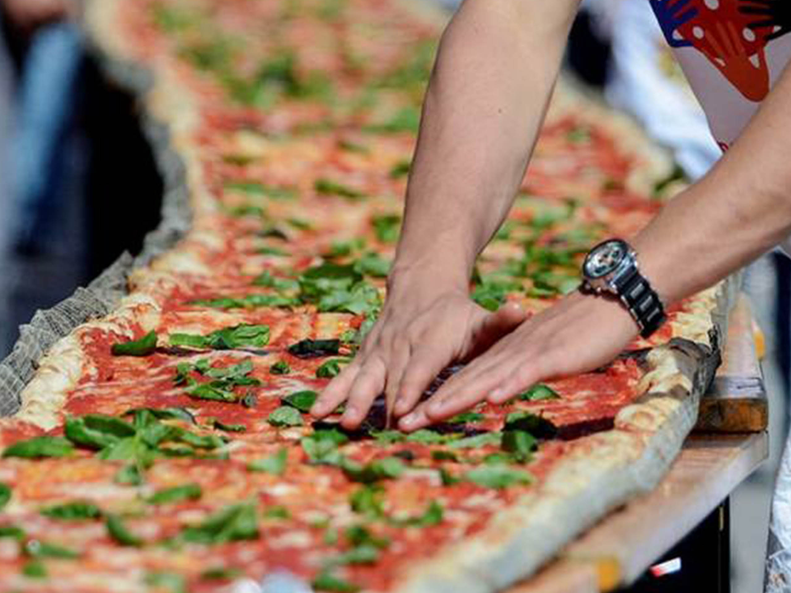 Al FICO Eataly World di Bologna, correva l’anno 2019, sessanta braccia hanno impastato, steso, condito, infornato la Pizza da guinness. Sono stati necessari 270 tavoli, per la cottura sono stati utilizzati due forni a legna che hanno cotto alla velocità di 120 metri all’ora.